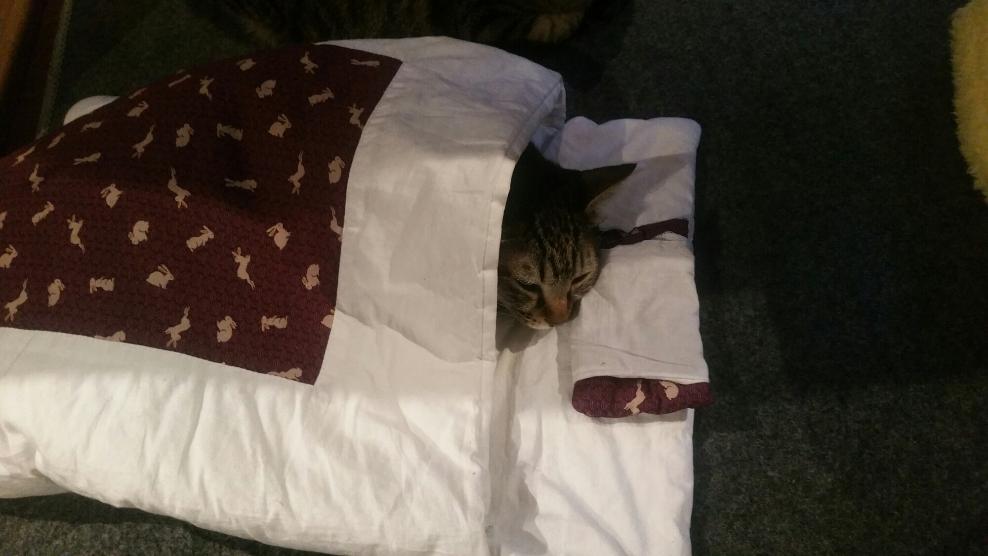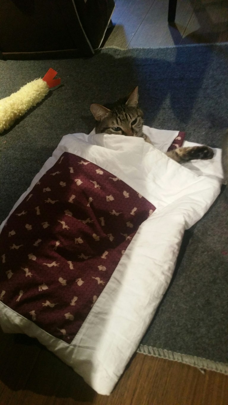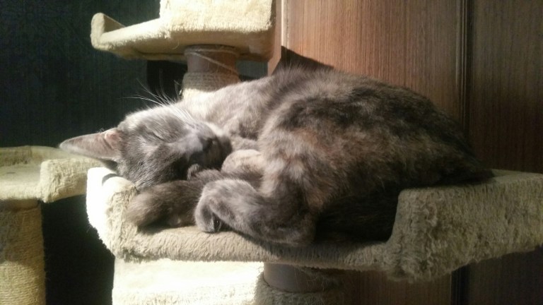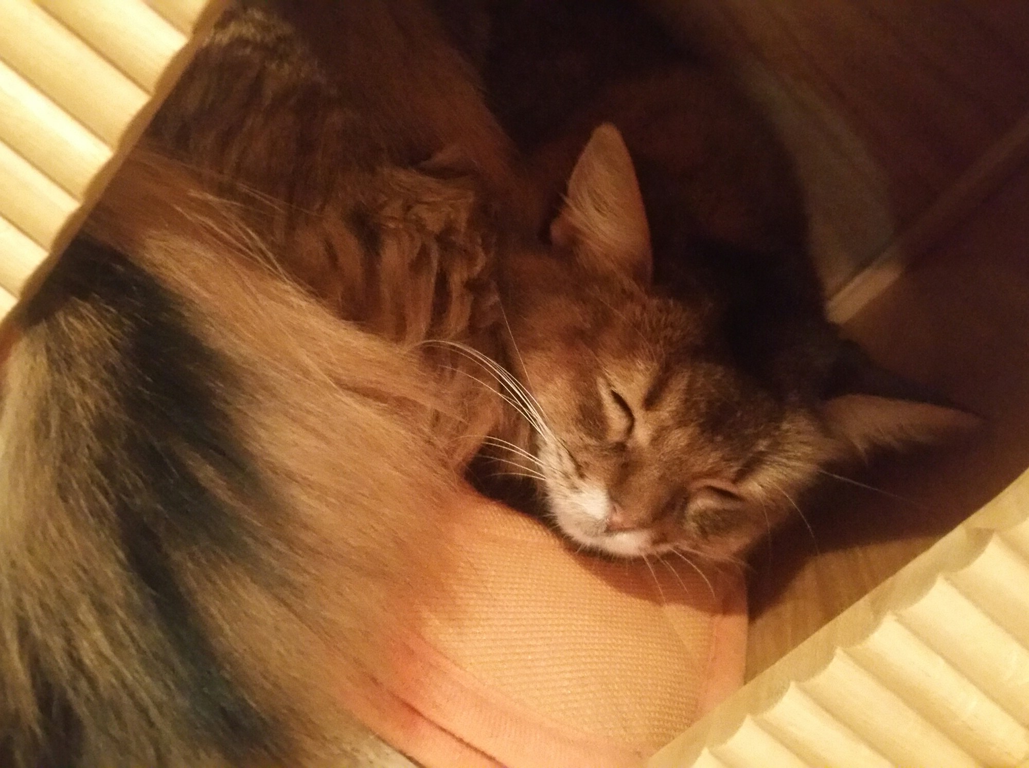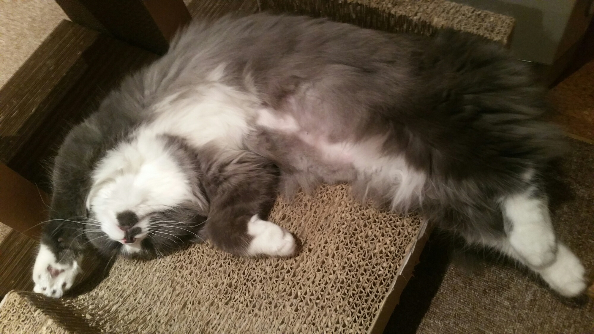 This one even had a bed. He was bopped by another cat a bit later and I caught a bit of his fuming reaction.