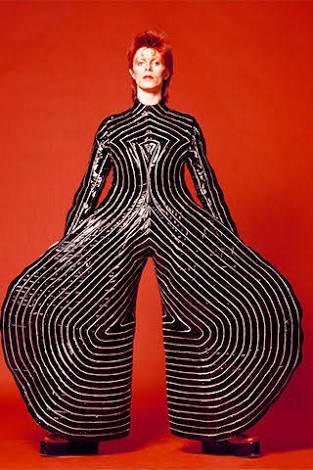 Loads of his costumes from over the years were there too, including the blue suit from the Life on Mars video and the outfits that Ziggy wore. His coat from Glastonbury 2000 was there too and it’s gorgeous when right there in front of you. Some of the exhibition was about his links with Japan too. He came here many times, choosing the traditional city of Kyoto as a place to visit regularly. The famous black outfit with the huge legs and the coloured striped one leg outfit from the early 70s was done by a Japanese designer, Kansai Yamamoto.