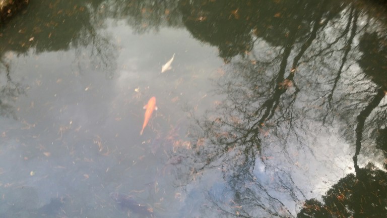 Beautiful Koi congregated in one part of the ponds and some of the gardens are islands in the pond.